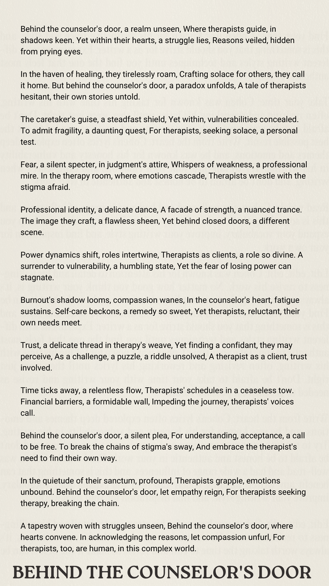The Caretaker's Dilemma: Therapists are trained to be empathetic, compassionate, and excellent listeners. They dedicate their professional lives to helping others navigate their emotional landscapes. However, this very role of being a caretaker can make it challenging for therapists to admit vulnerability and seek help. There exists an unspoken expectation that therapists should have it all figured out, creating a paradoxical situation where the caretakers become reluctant recipients of care.